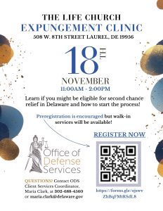The Life Church Expungement Clinic will be held on Tuesday November 18th, 2025, from 11:00am – 2:00pm at The Life Church in Laurel (508 W 8th St. Laurel, Delaware 19956)Preregistration is HIGHLY recommended but walk-in services will be available on a first-come, first-serve basis.