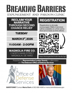 The Breaking Barriers Expungement and Pardon Clinic hosted by Representative Lyndon Yearick in collaboration with The Delaware Office of Defense Services will take place on Tuesday March 3rd, 2026, from 11:00am – 2:00pm at The Magnolia Fire Company (2 North Main St., Magnolia, DE 19962).