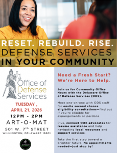 Join us for Community Office Hours with the Delaware Office of Defense Services (ODS) on Tuesday April 21st, 2026 from 12pm – 2pm at the Art-O-Mat (501 W. 7th Street Wilmington, DE 19801).