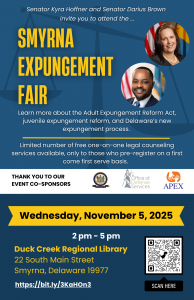 The Smyrna Expungement clinic in collaboration with Senator Darius Brown and Senator Kyra Hoffner will be held on Wednesday November 5th, 2025 from 2:00pm – 5:00pm at the Duck Creek Regional Library (22 South Main Street, Smyrna, DE 19977). Preregistration is strongly encouraged but walk in services will be available as time/capacity allows. We can only assist with Delaware criminal records.